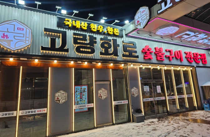 고량화로는 서천 이마트에브리데이 마트 위 2층에 위치합니다. 외부 주차 공간이 협소한 편이긴 해요;; 대략 10대 정도 들어가는 공간으로 보였는데 이마트와 주변 상가 주차 전용 공간을 나누어 사용하기에 고량화로 전용 고객 공간이 1-2대 정도였어요.