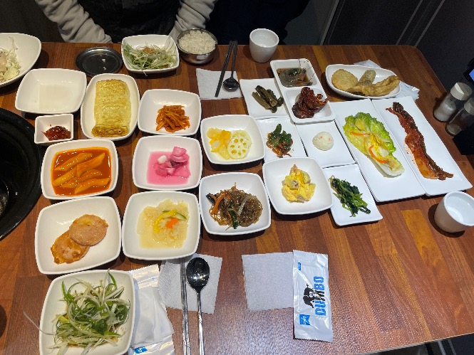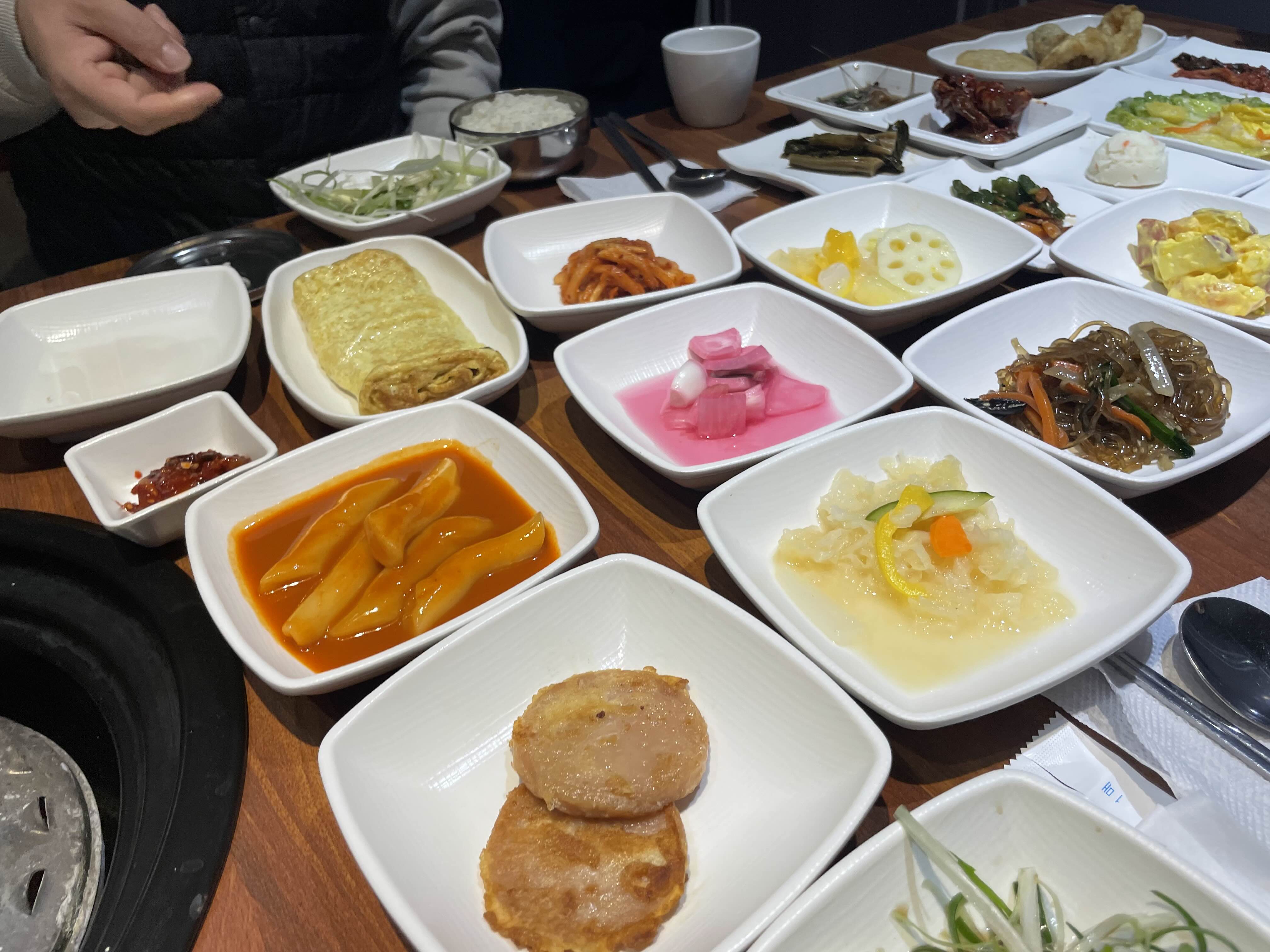 서천 고량화로 고깃집 갈비 주문하고 기본 상차림으로 주문했어요. 떡볶이, 튀김, 각종 김치, 소시지, 나물, 샐러드, 계란말이 등 각종 밑반찬이 20가지는 되네요!!