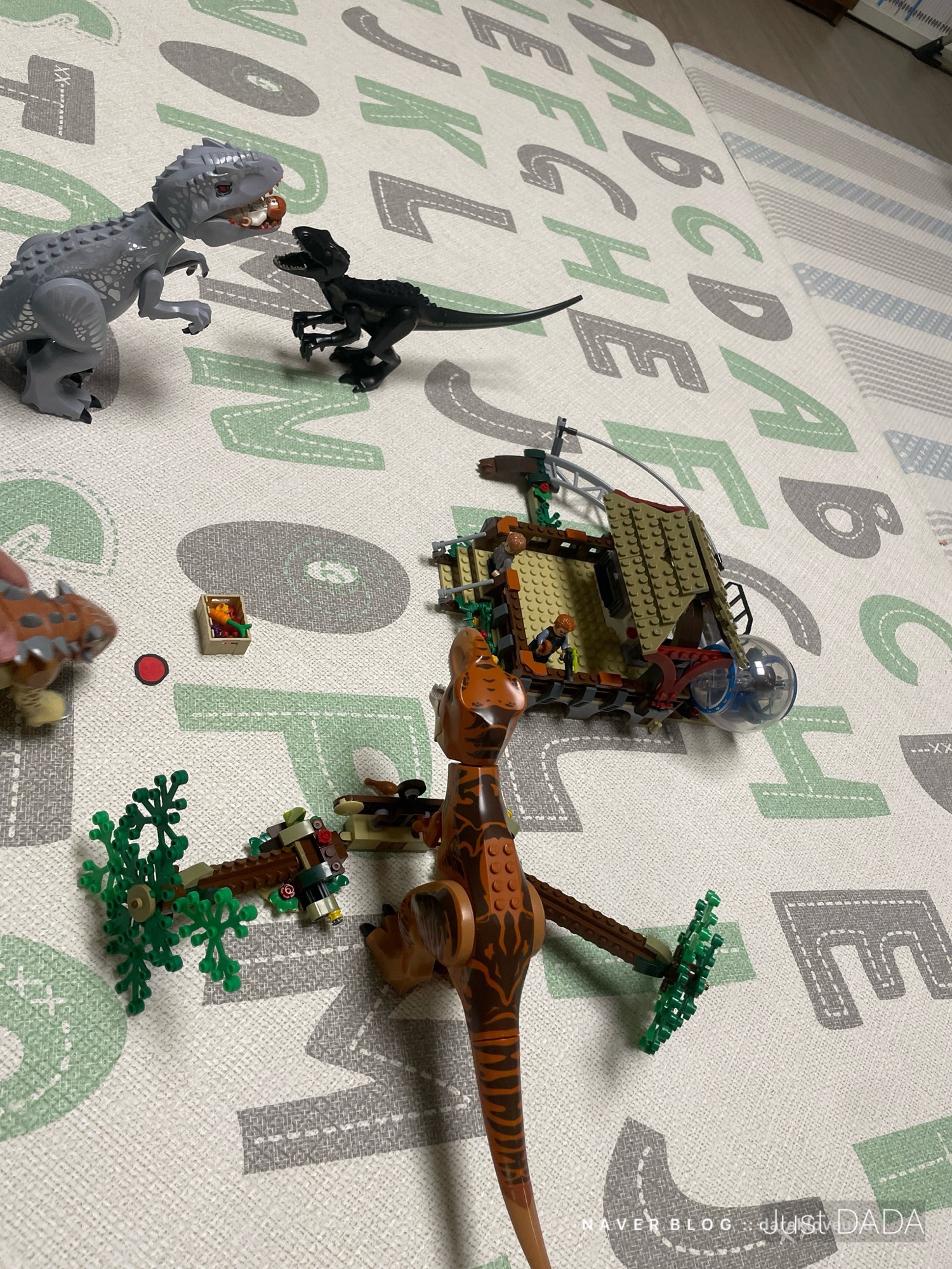 쥬라기월드 공룡 레고에서 건축물보다 공룡 피규어를 좋아하는 아이. 피규어로 역할극이 한창이에요.