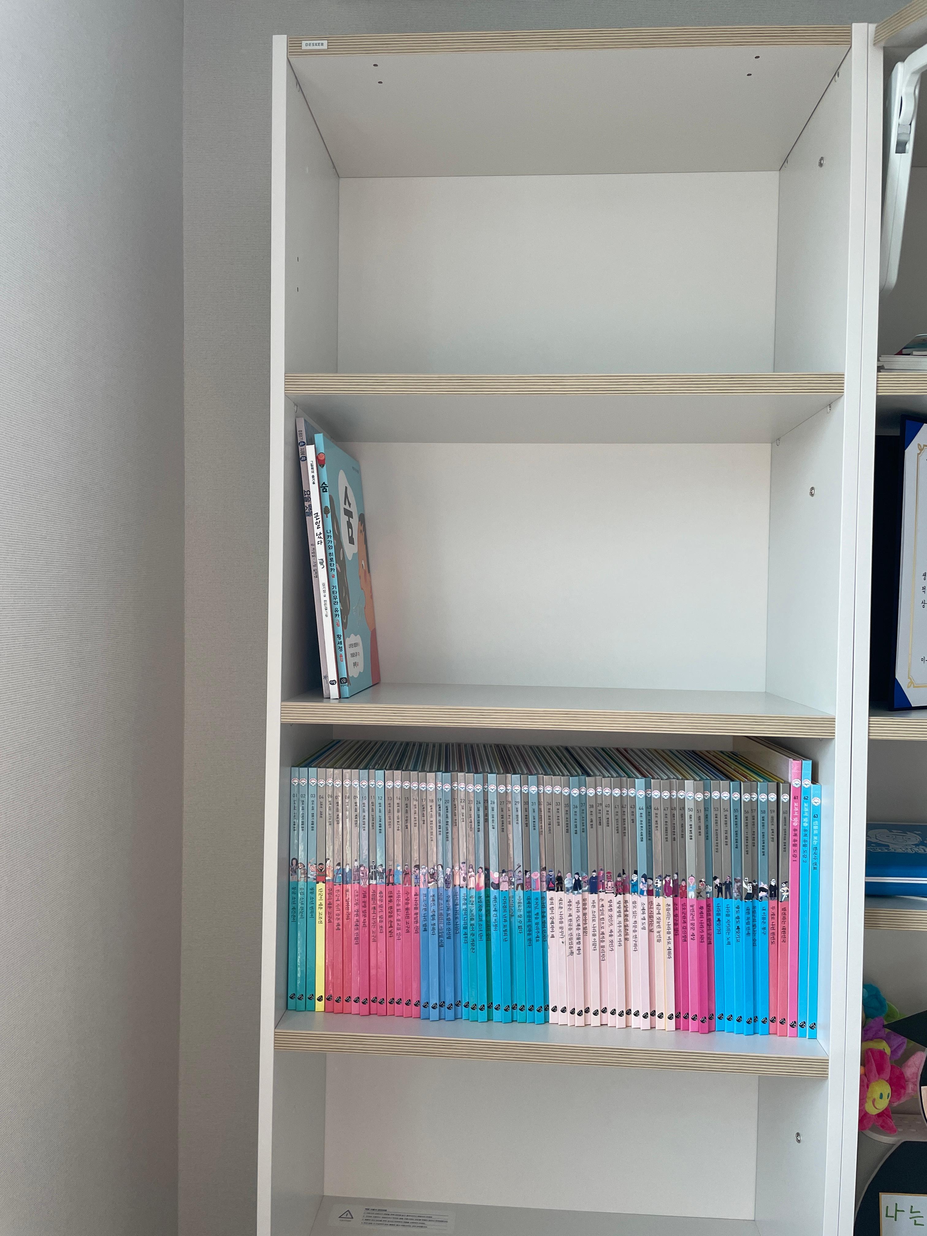 책장도 함께 구매해서 책을 분리해서 수납하다보니 책상 수납 공간이 넓어서 아이 장난감도 몇개 전시하고