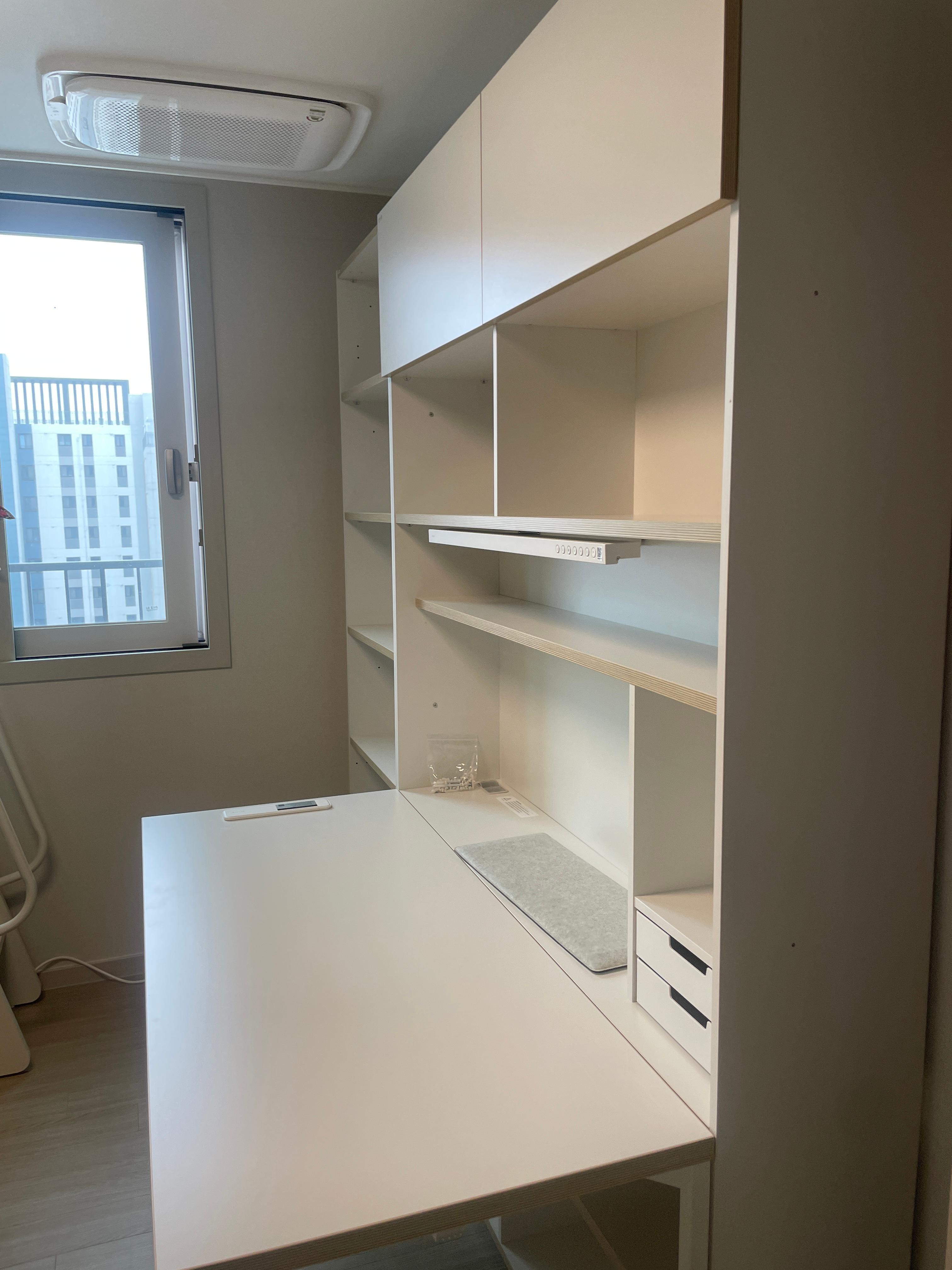 데스커 책상 양 옆으로 책장을 두고 벽면 전체를 책상으로 사용하는게 예쁘고 대부분 넓게 사용을 하시던데요, 그래서 인지 책장 높이 분할과 책상 분할이 맞춰져 있어요!