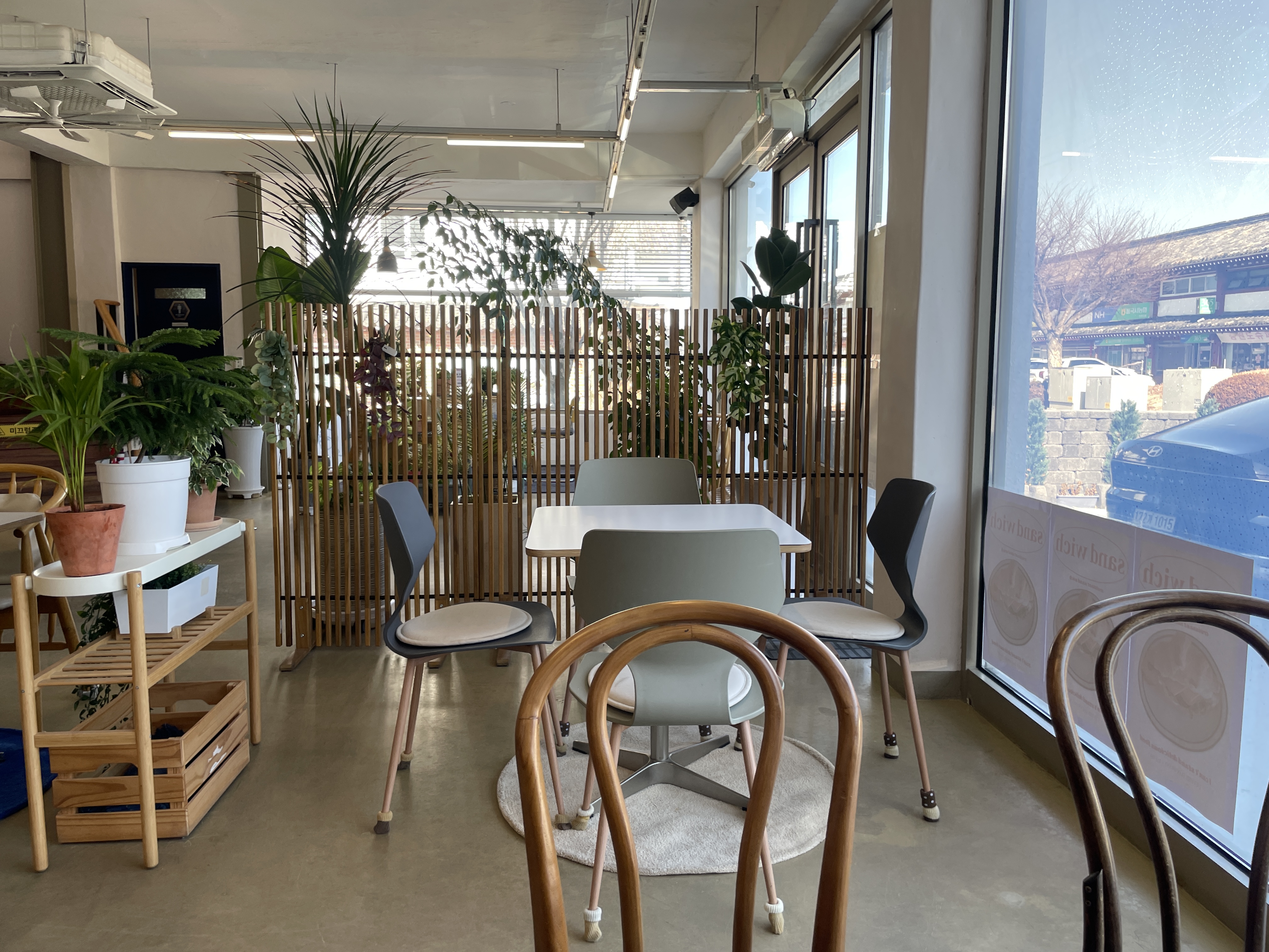 경주 카페 맛집 로머스 실내 인테리어 우드와 각지각색 화분들이 놓여져 친환경 느낌의 친화적 분위기였어요.