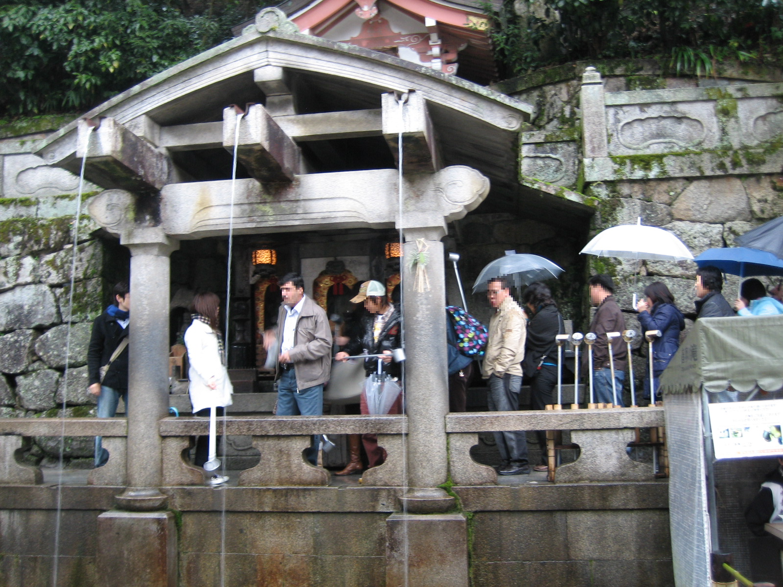 '순수의 물'이라 불리는 오토와의 폭포에서 흘러나오는 세 갈래 물줄기는 각각 장수, 학업, 사랑을 기원한다고 해. 관광객들은 병풍으로 막힌 돌을 피해 국자로 한 가지씩 떠 마시며 소원을 빕니다.