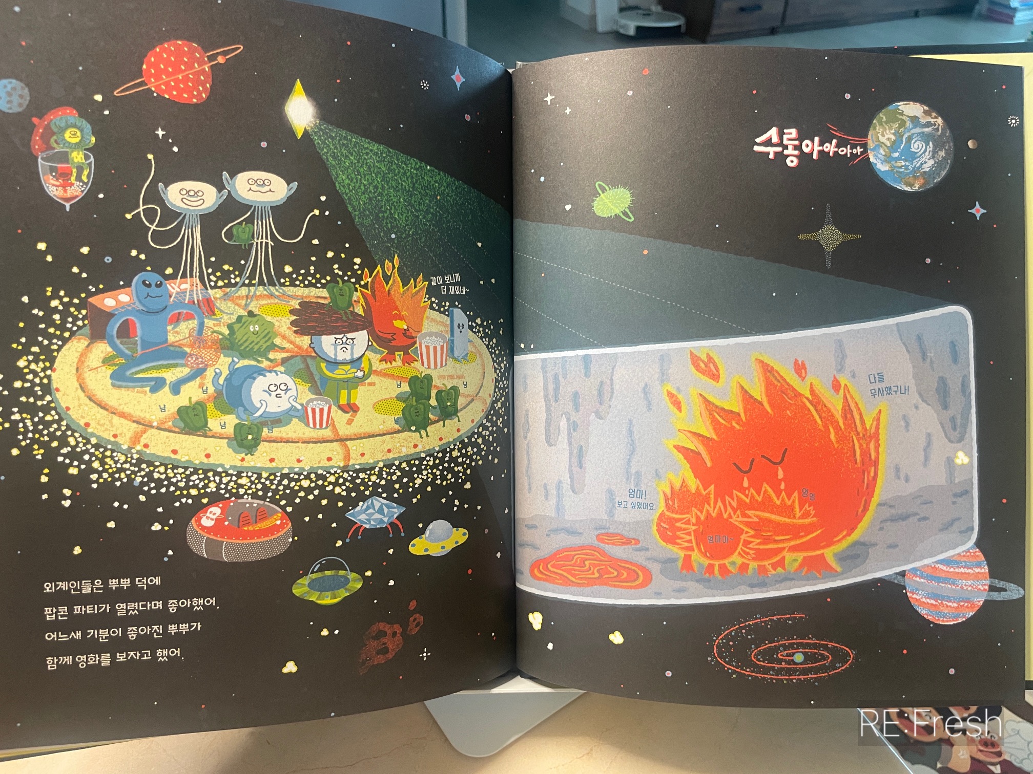 우주에 사는 외계인들이 고소하고 달콤한 팝콘 냄새를 맡기 시작했어요.
