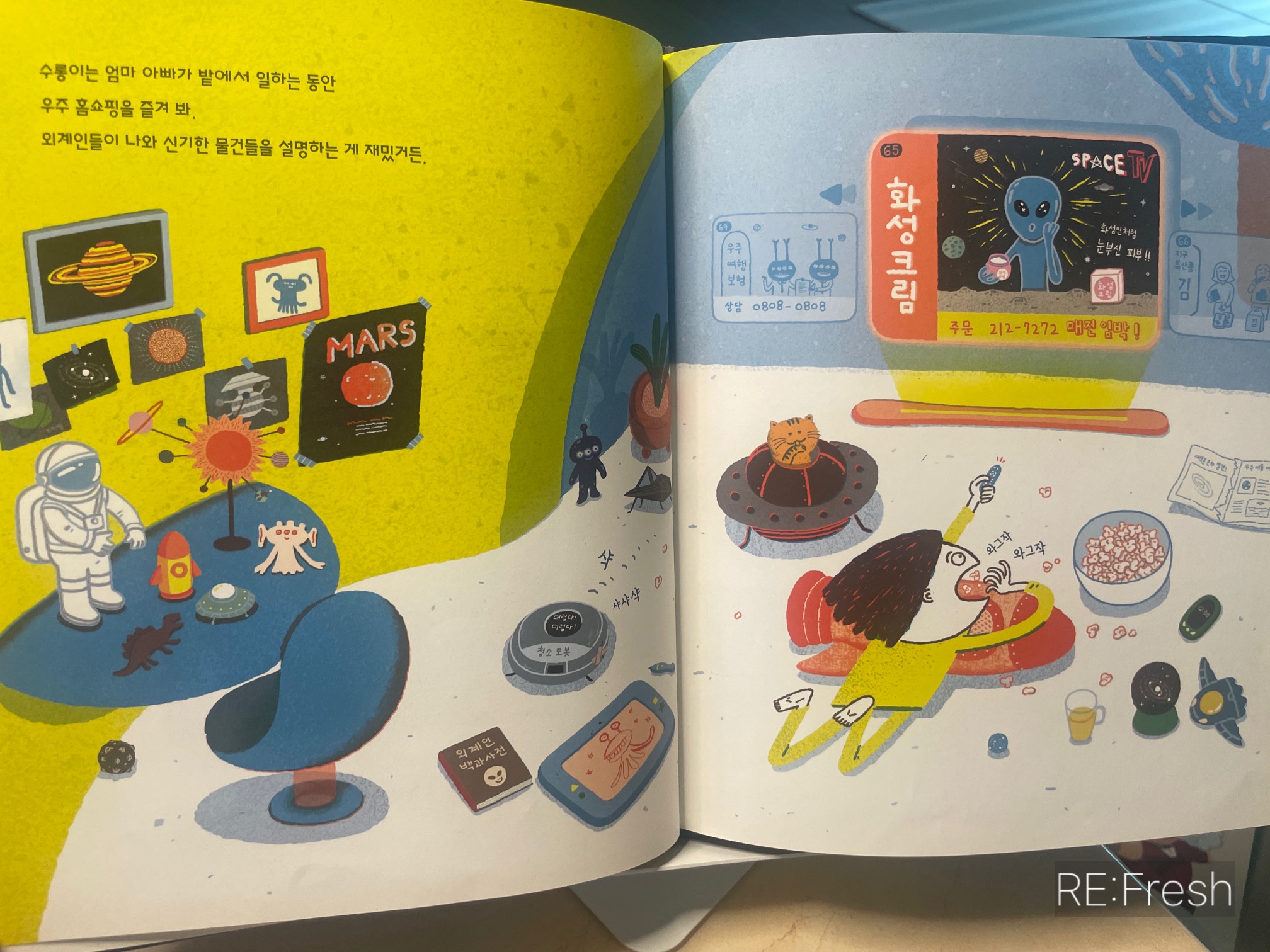 지구인 수롱이는 우주가 궁금해요. 오늘도 엄마아빠가 밭에서 일하는 동안 tv에 외계인들이 나와 신기한 물건을 설명하는 프로그램을 즐겨보고 있어요.