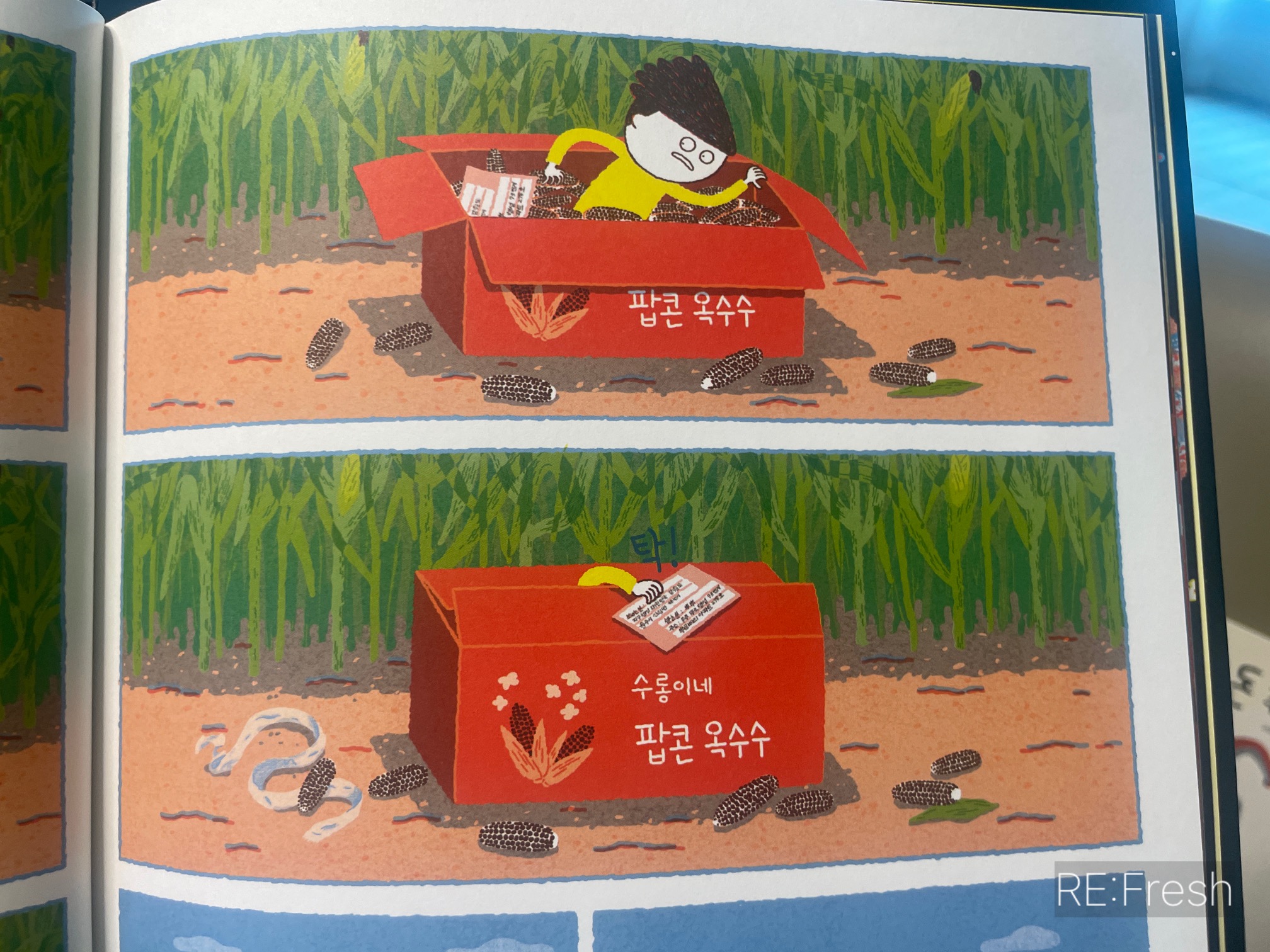 바로 그때. 너무 뜨거운 태양열로 인해 수롱이네 팝콘옥수수 택배 박스가 두둘 움직이기 시작해요!!!