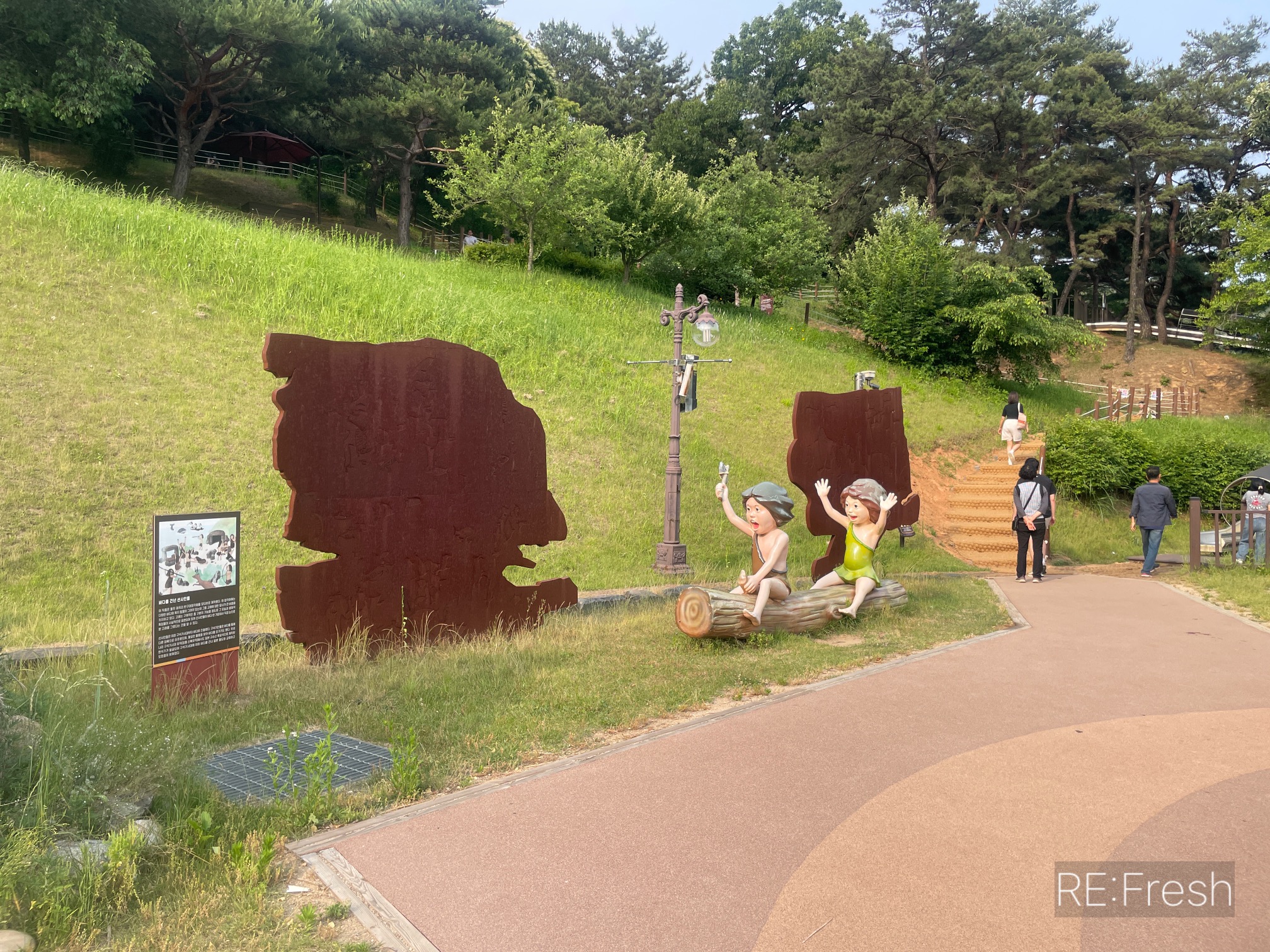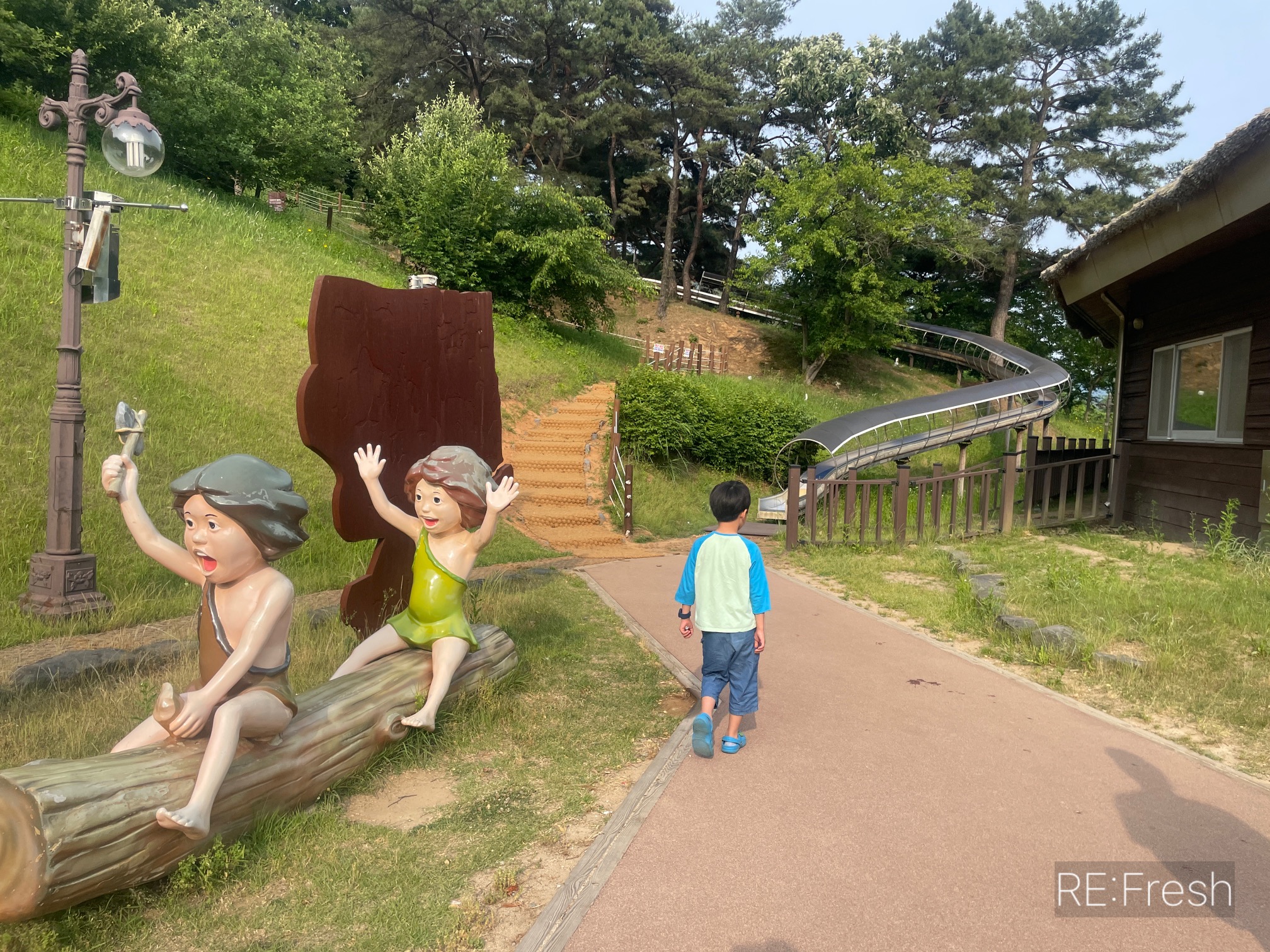 금강 옆에 유적지가 구성되어 있는데요. 강가에서 물고기 잡기, 이동생활, 막집터 등 구석기 시대 생활이 가능했을 것 같은 흔적이 보이는 지형이라 더 새로웠어요. 박물관 관람 후 아이들 놀이터 둘러본 후 안쪽에 자리한 미끄럼틀을 타러 갔어요.
