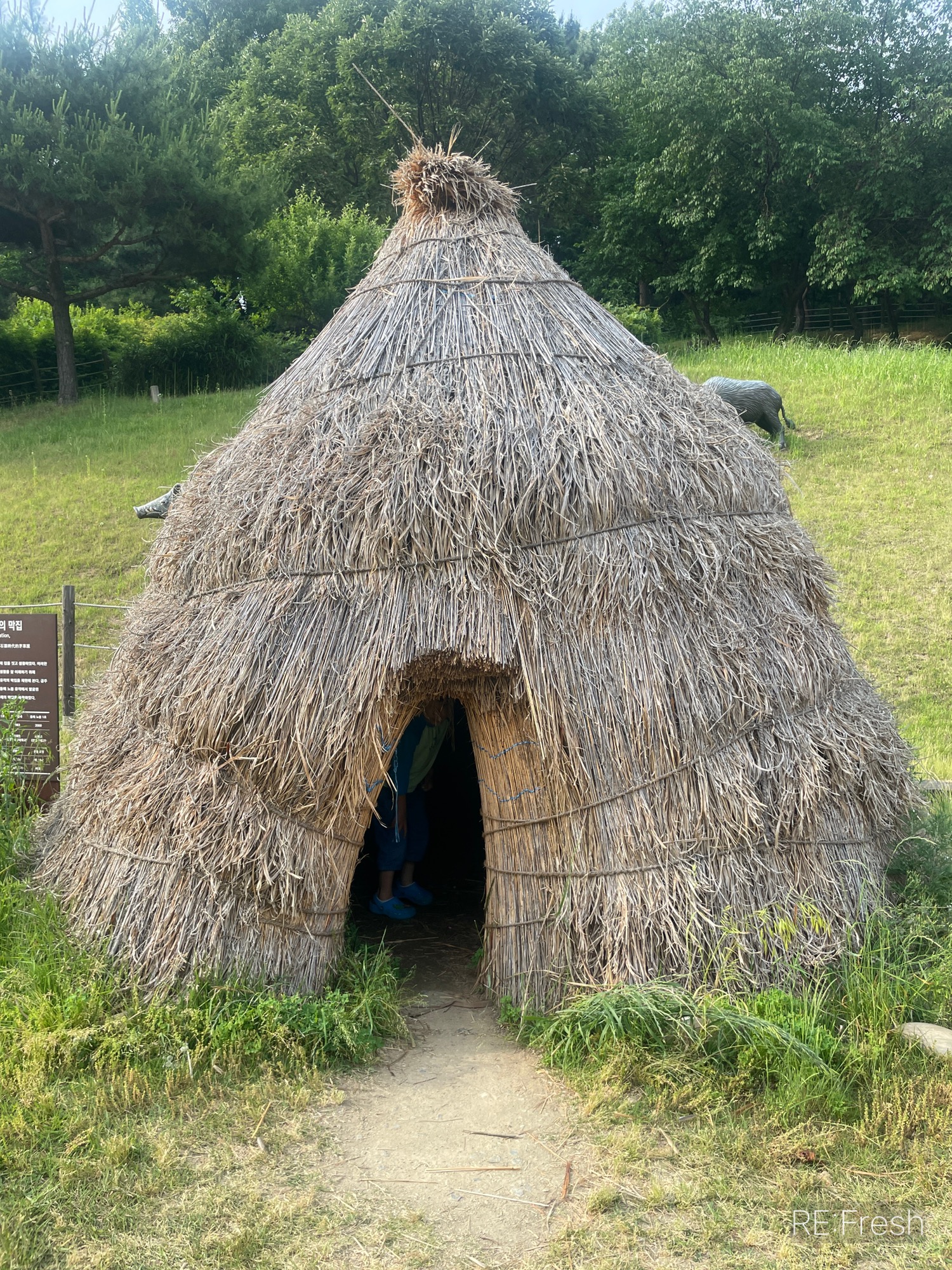 구석기 시대는 농사를 짓지 않아 강가에서 물고기를 잡아먹거나 이동식 생활을 했기에 막집을 짓고 살았어요. 석장리유적지 안에는 막집을 그대로 구현해 안에도 들어가 볼 수 있도록 만들어 두었어요.