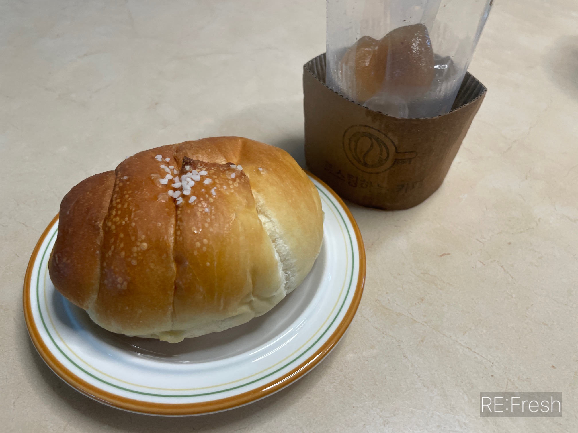 로스팅하는카페 서천점에서 별도로 구매해 온 아메리카노 거의 다 마셔가고 함께 사온 소금빵 아침으로 먼저 먹어봤어요.