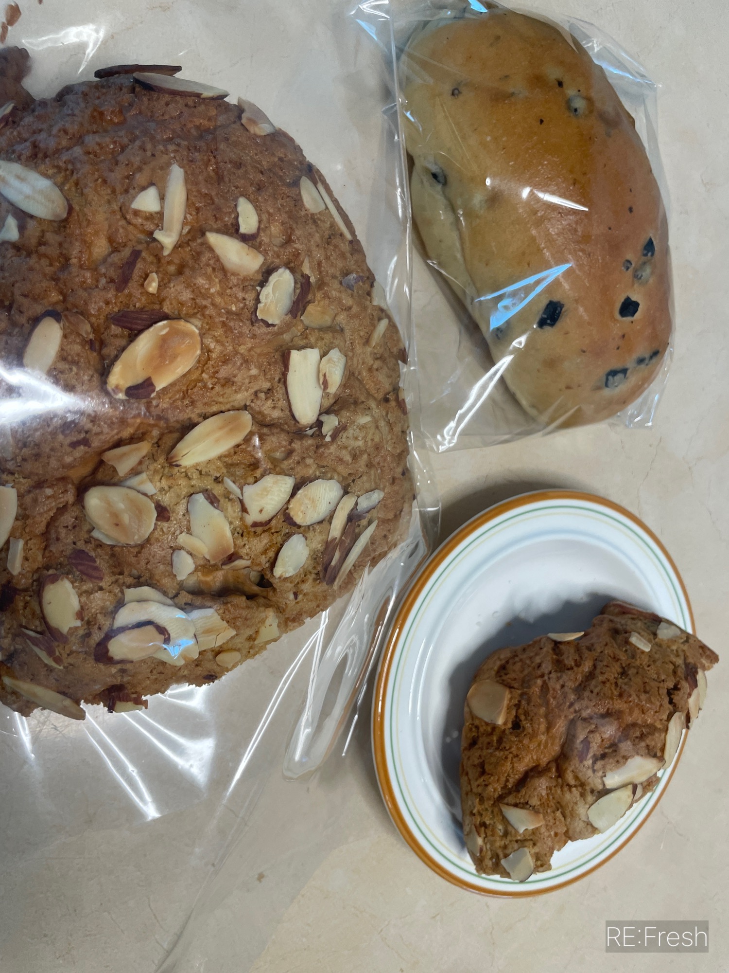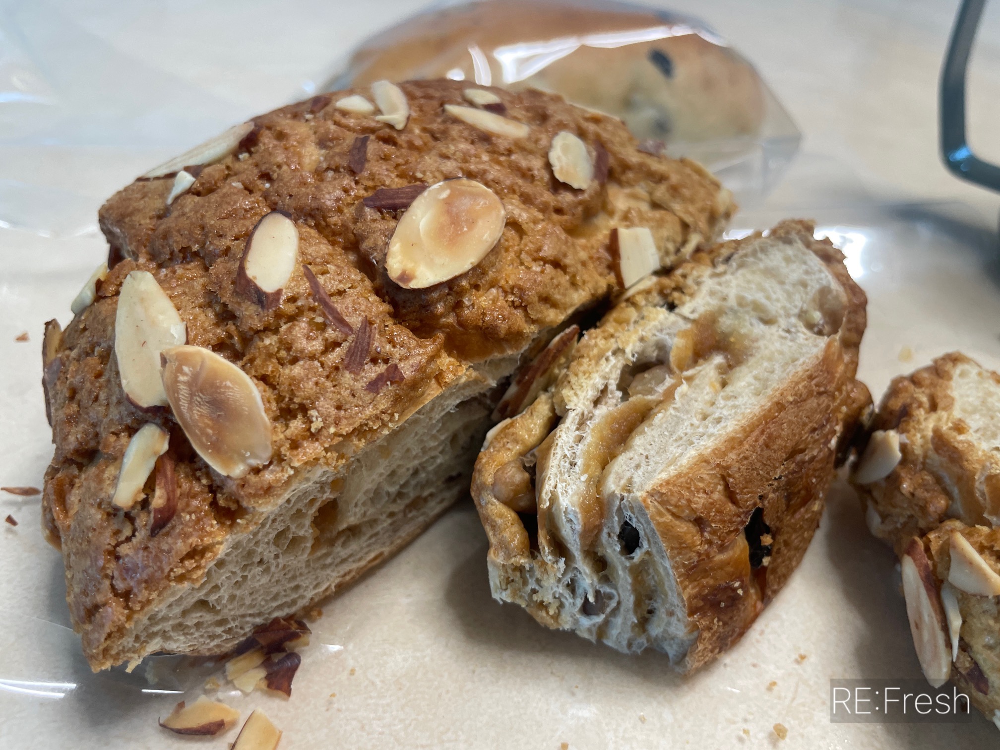 위에 도톰한 모카 코팅이 바삭해보이고 아몬드가 마구 올라가 있어요. 고소한 견과류 더해져 크기도 커서 가성비도 좋죠! 거기에 빵이 퍽퍽할 수 있었는데 카야쨈이 들어가 있어서 막 달지 않고 풍미 좋고 적당한 양이라 더 좋았던 카야 & 모카 두 조합이 잘 어울리더라구요~
