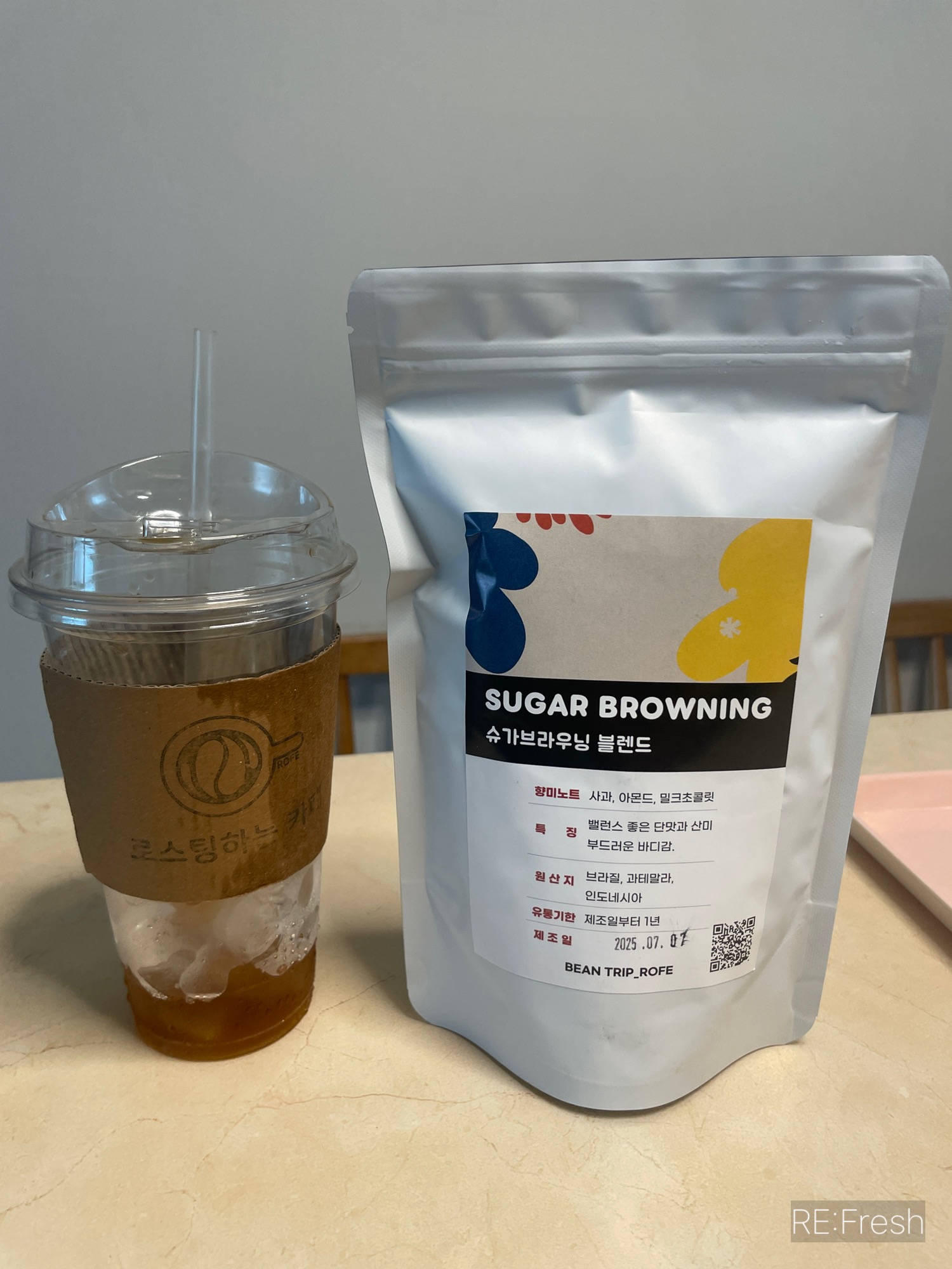고소한맛 아메리카노와 동일한 원두라고 하셨어요. 처음 방문한 커피집이었는데 직접 볶은 로스팅 원두가 필요해서 함께 구매해 왔죠. 제가 구매한 원두는 슈가브라우닝으로 고소한 맛이고 브라질, 과테말라, 인도네시아 원두라고 해요.