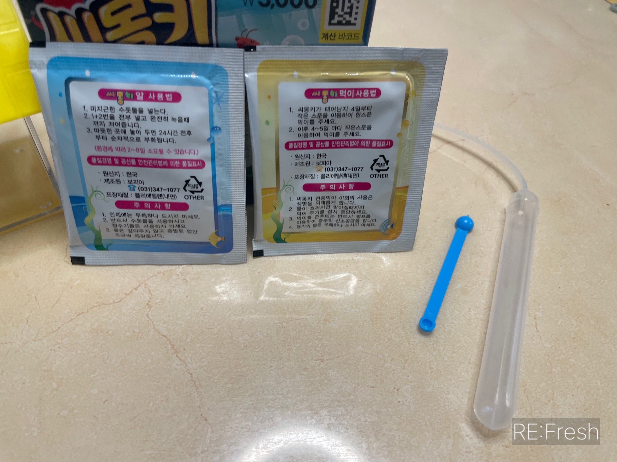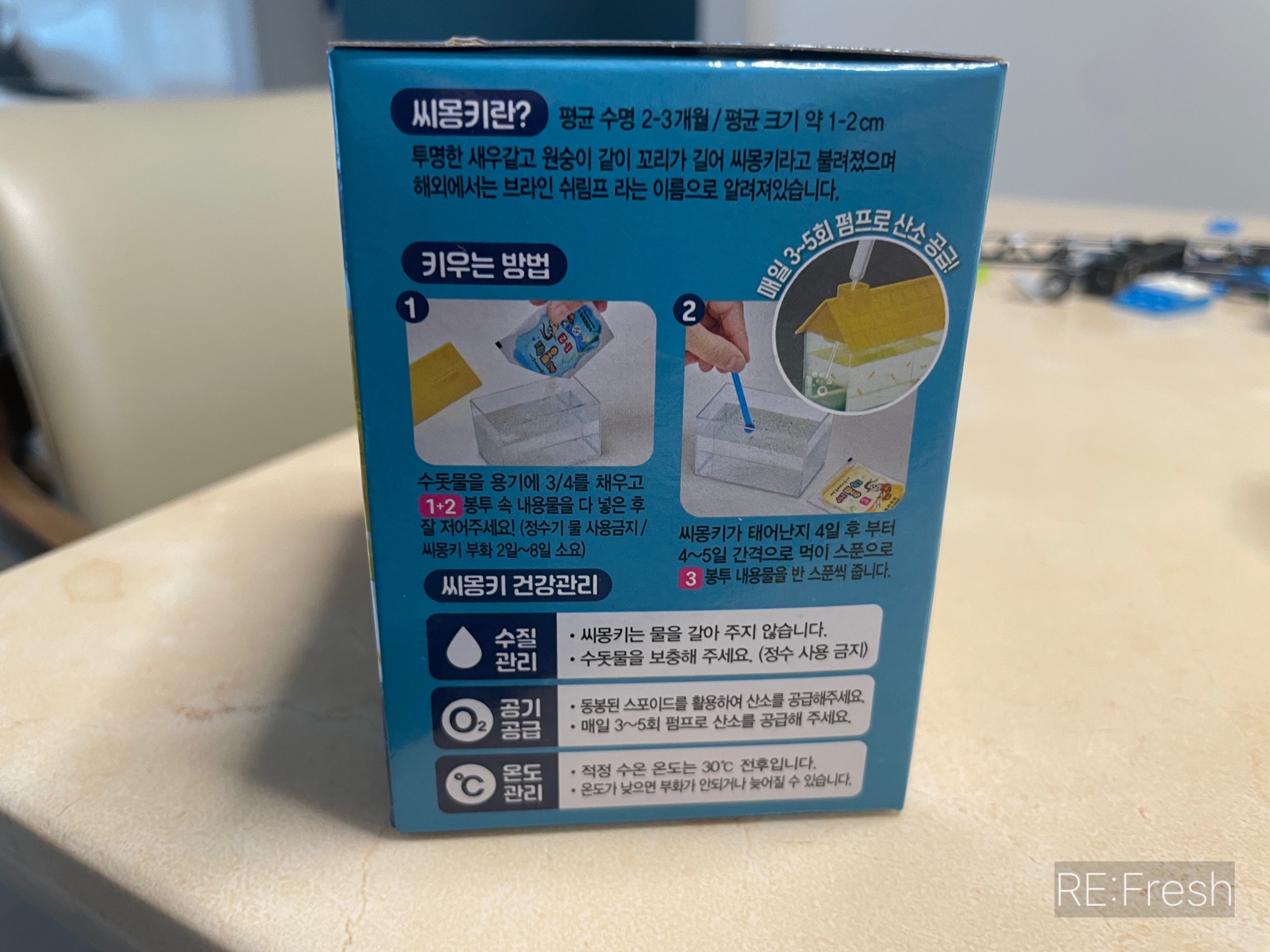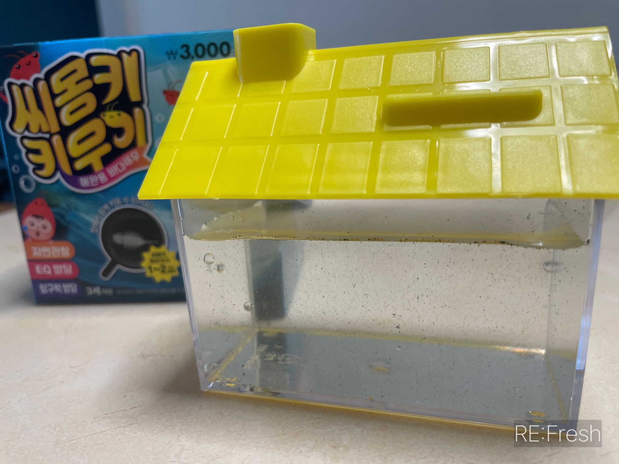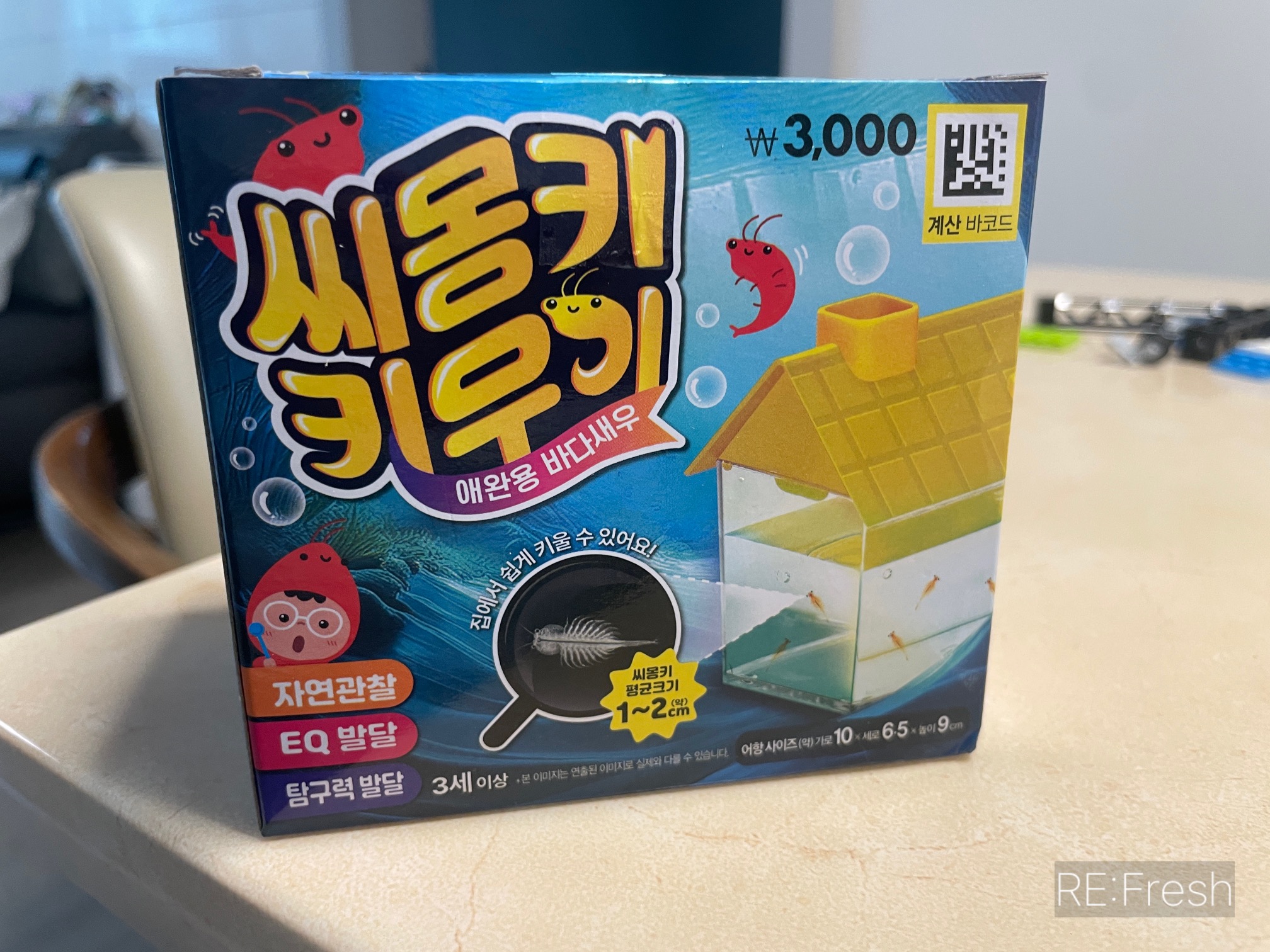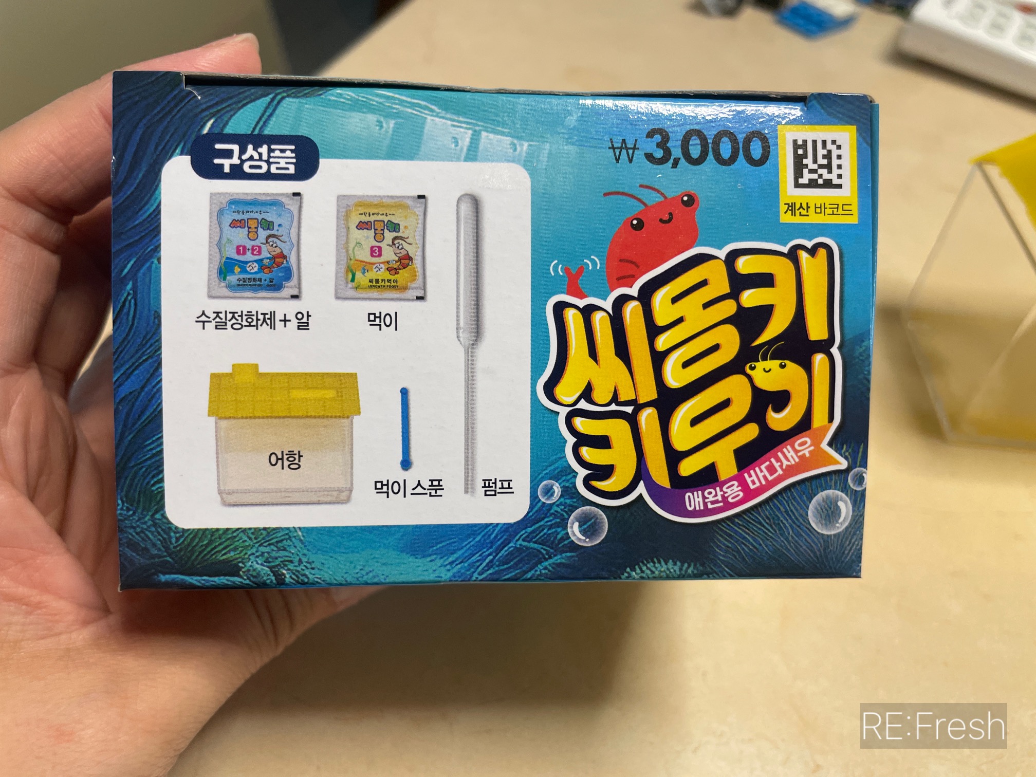 바다새우 씨몽키 키우기 키트인데요. 가격: 3000원으로 저렴합니다. 어항에 물붓고 수질정화제와 알을 넣어주면 부화한다고 해요!
