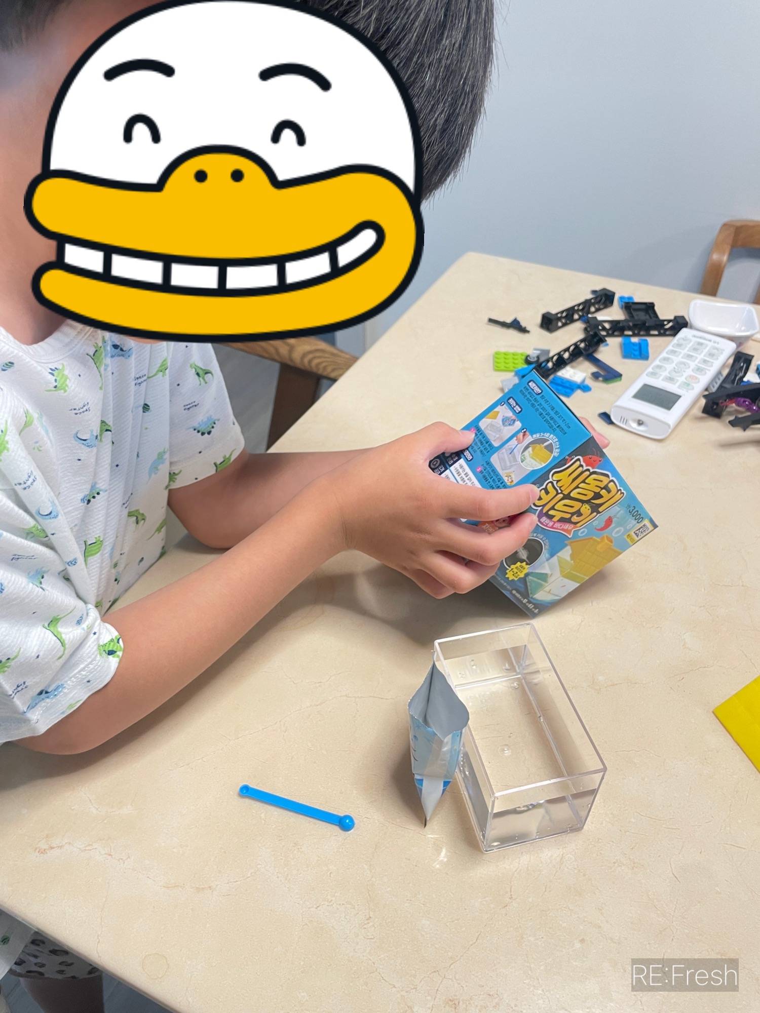 박스에 적힌 설명서를 꼼꼼히 읽고 있는 꼬마