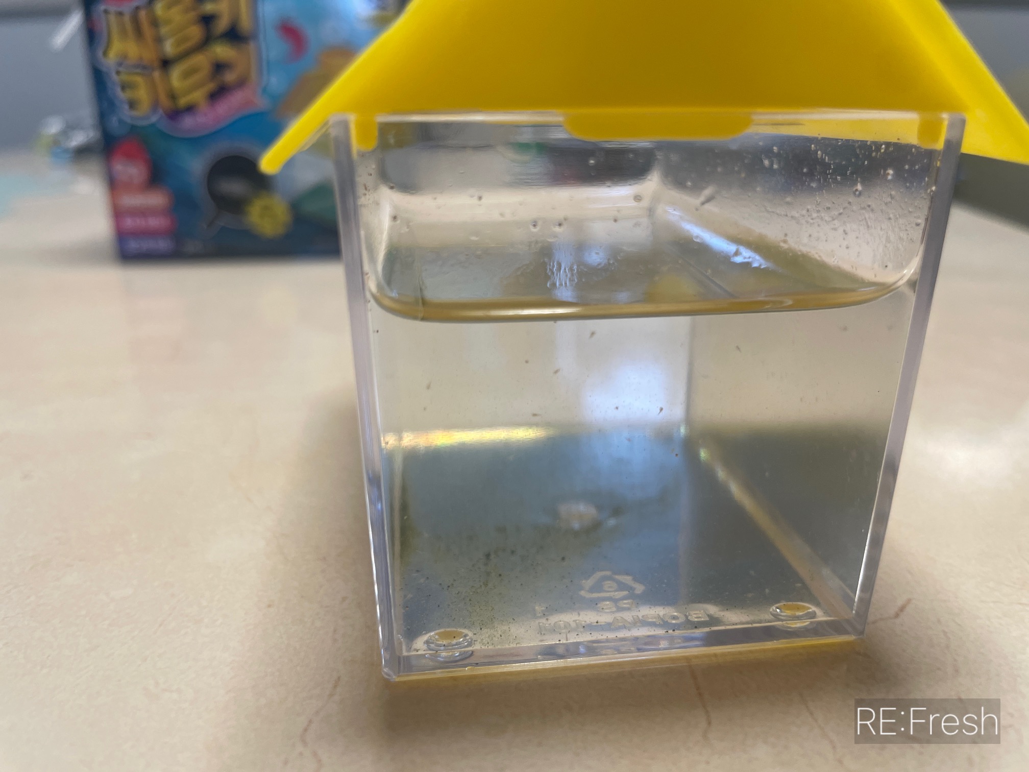 씨몽키 키트 수질정화제와 알이 녹은 어항을 찍어 보았어요. 이제 부화하기까지 2-8일 정도 기다려야 해요!
