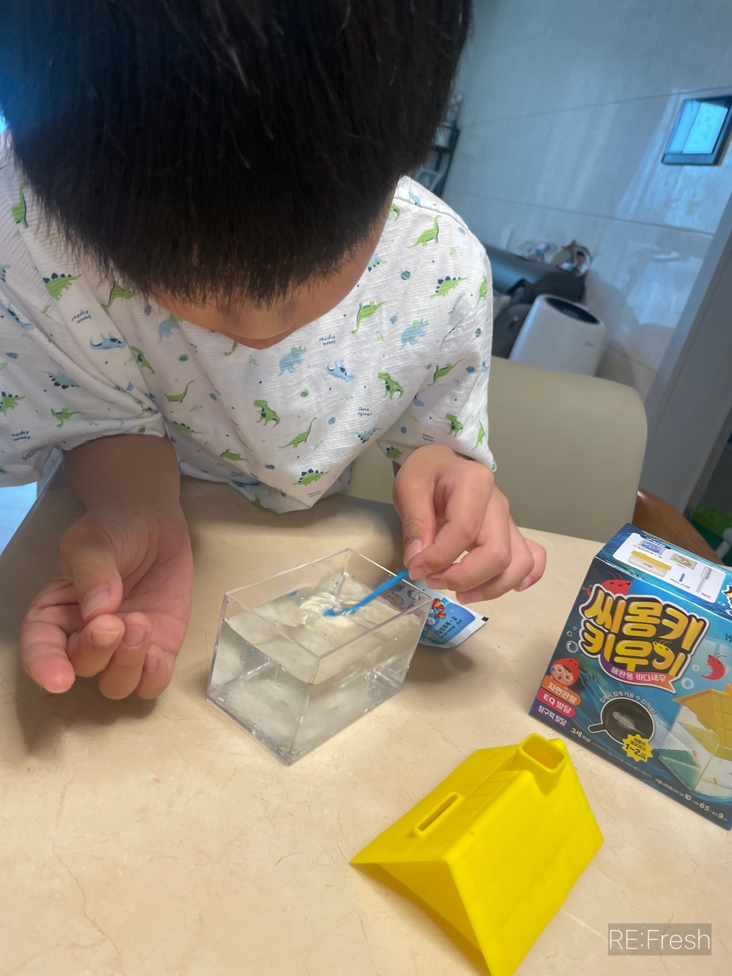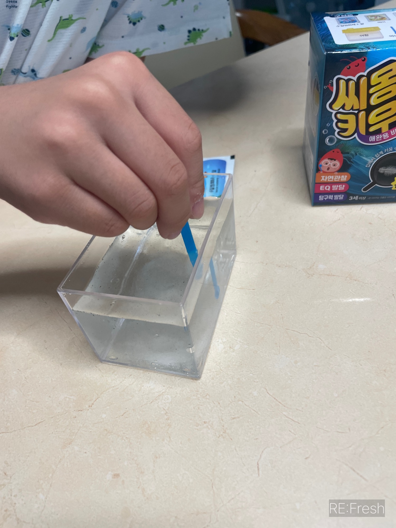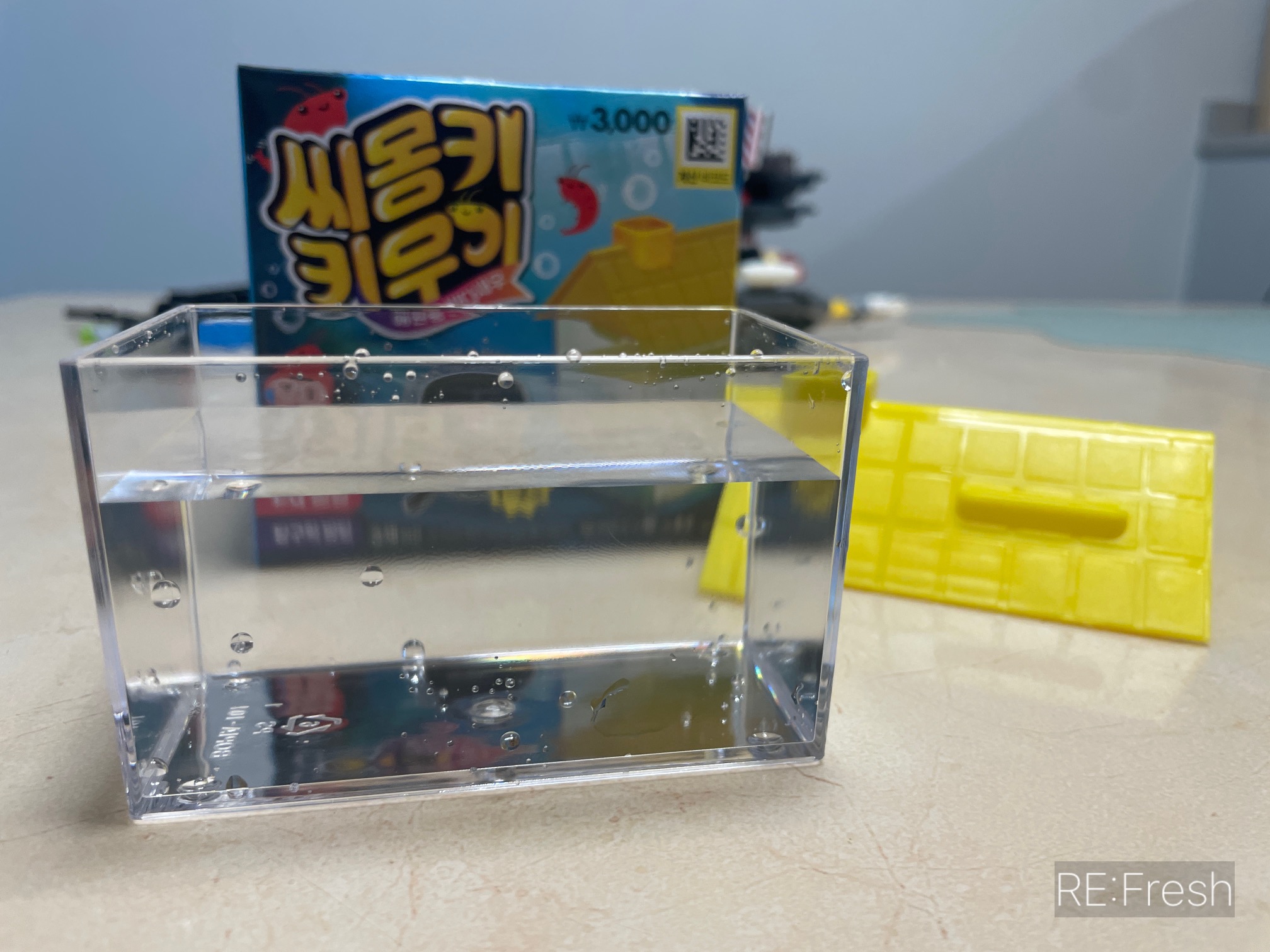 씨몽키키우기 키트에 들어 있는 작은 어항에 수돗물 3/4 정도 넣어 주었어요.