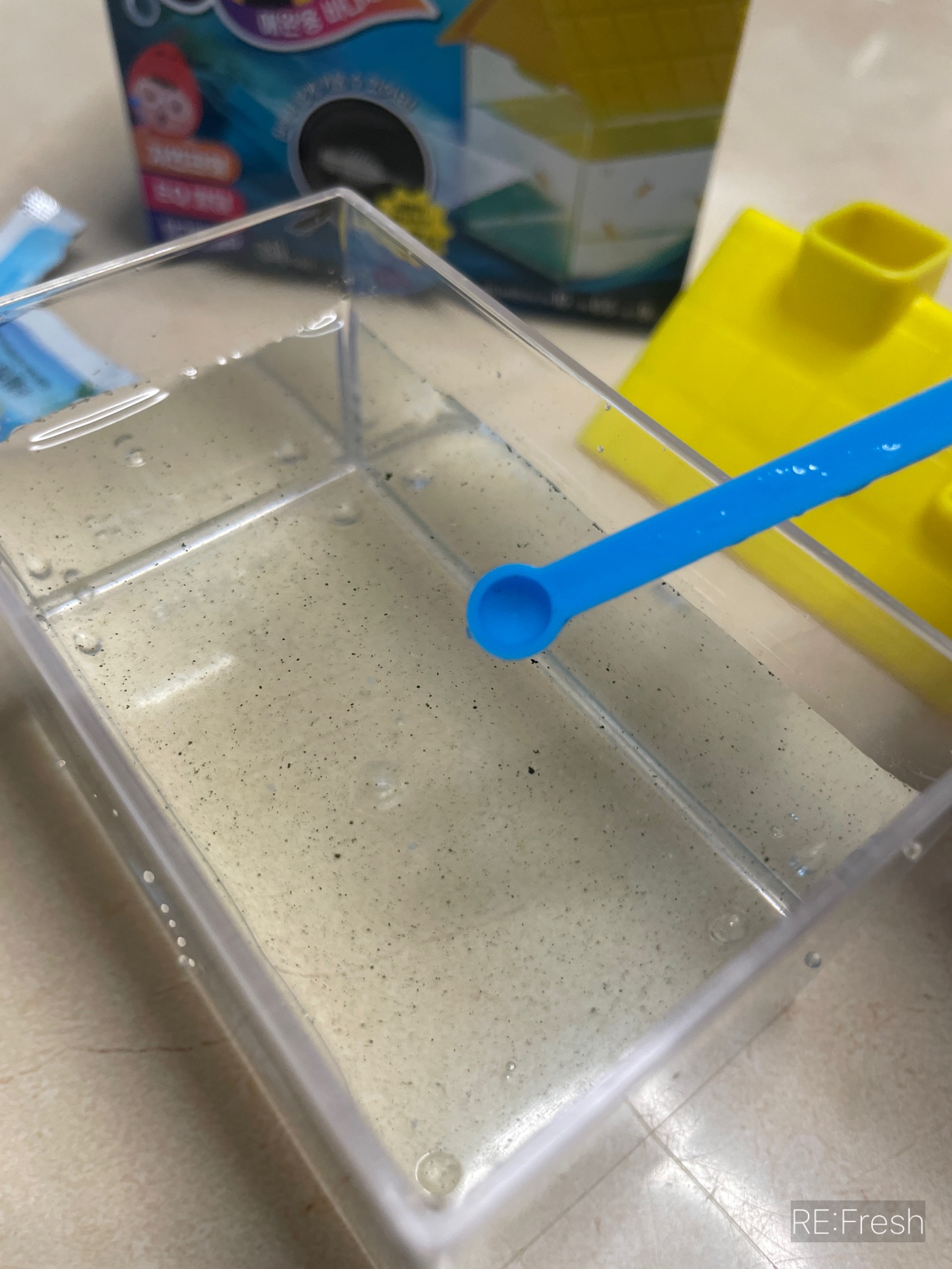 박스에 들어 있는 어항에 수돗물 그대로 3/4 정도 넣고 1번 봉지 전부 넣어서 휘휘 저어 줍니다.
