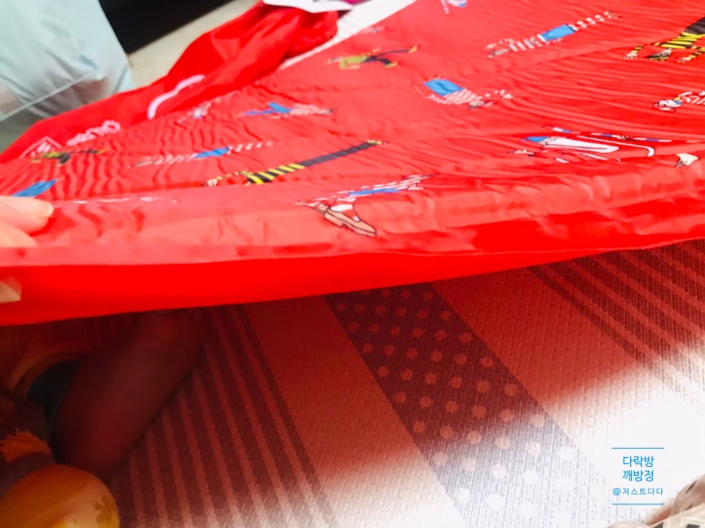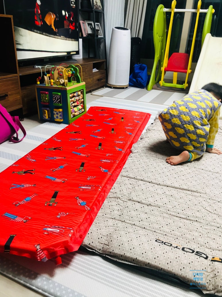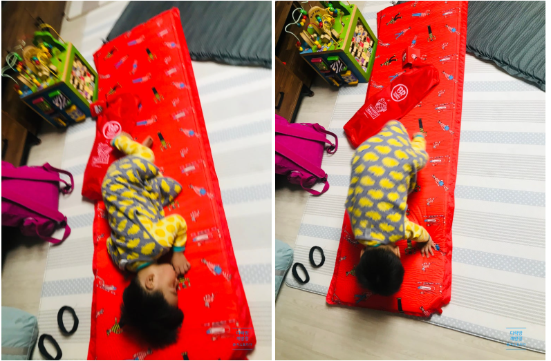 공기 빵빵하게 채워지 배라매트 캐릭터 때문인지 아이가 뒹굴뒹굴 좋아하네요~ 아이가 누우니 좁은 사이즈가 딱 맞아보여요. 저희 사용중인 매트 옆에 놓고 쓰면 바닥 폭신해지고 아이가 텐트에서 넓게 뒹굴기도 좋을것 같아요~