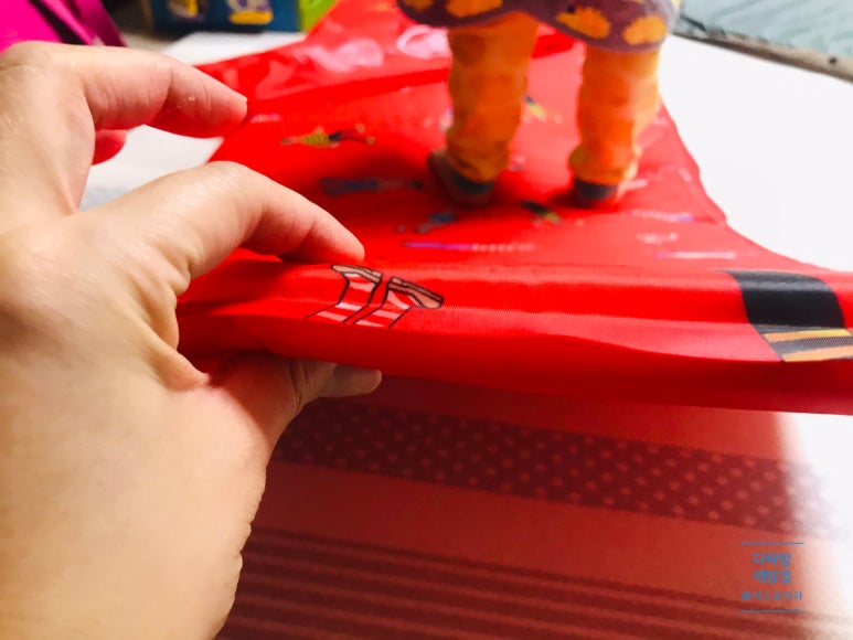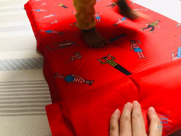 월리매트 두께는 제법 부풀어 오르네요. 고투 매트보다는 조금 얇지만 귀여운 패턴이 마음에 들고 싱글매트로 사용하기에 무리가 없어 보여요.