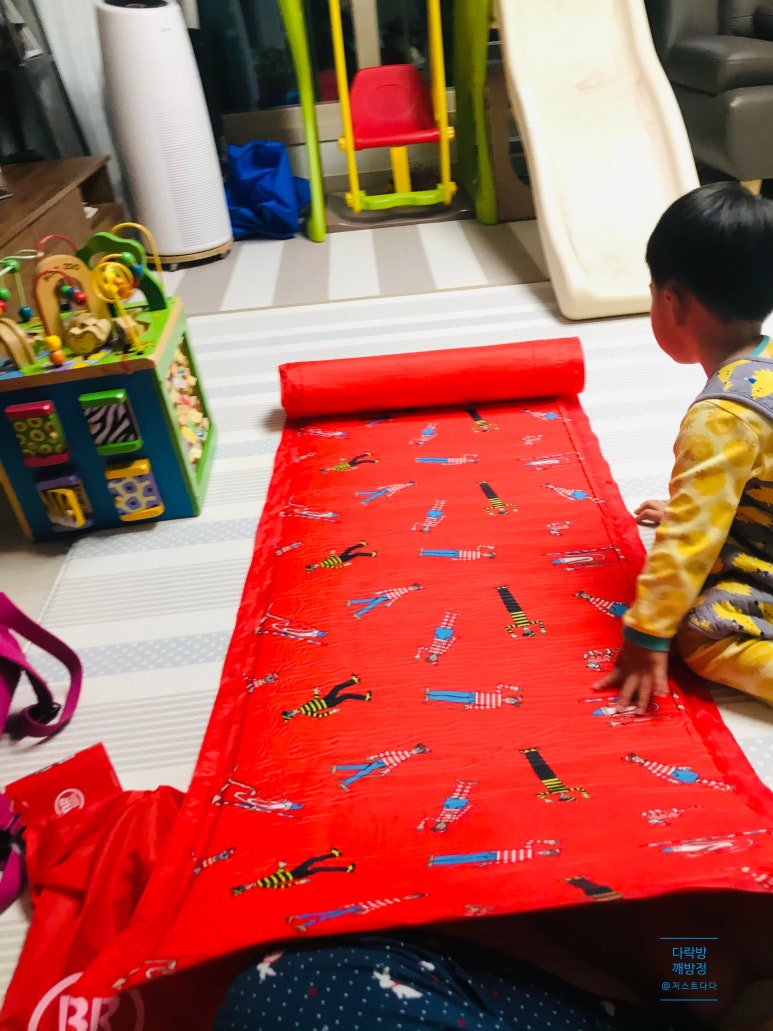 월리 패턴도 귀엽고 단돈 100원에 구입하다니! 이런 득템이 어딨나요 ㅎㅎ 크리스마스 1주일전, 동네에서 장보다가 배라 앞에 붙은 월리 캠핑에어매트를 보고 남편과 살짝 살까말까 망설였었죠..
