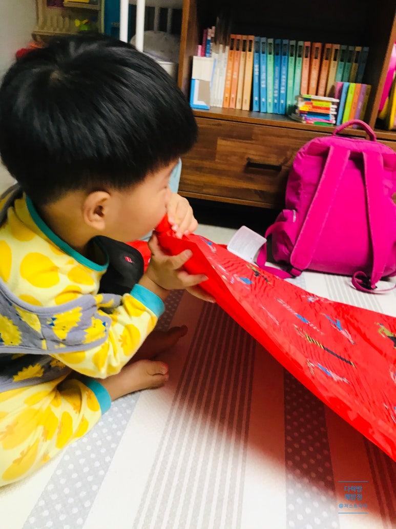 아이가 새빨간 눈에 띄는 아이템에 새로운 물건이 등장하자 눈이 휘둥그레. 궁금해 했어요^^