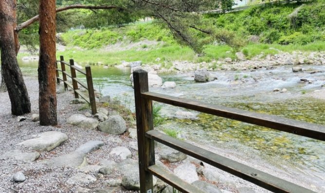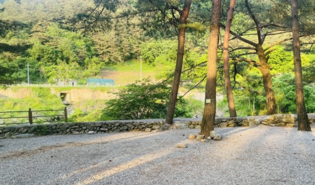 솔밭동 9번 자리가 계곡 바로 앞 나름 명당입니다. 계곡 내려가는 길목 사람들이 지나갈 수 있는 길처럼 턱이 높게 올라가 있는데요. 이곳에 캠핑체어도 올려놓고 계곡 물멍도 할 수 있더라구요 ㅎㅎ