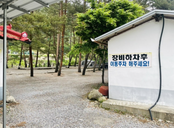 내리계곡 솔밭캠핑장의 솔밭동 사이트 단점은 오토캠핑 사이트가 아니라서 짐 내리고 차는 주차장에 따로 빼두어야 합니다. 차를 테트리스 잘해서 짐 내리고 다시 차를 뺴야해요. 저희가 방문했을땐 이용자가 없어서 차를 가지고 들어가서 짐을 내리고 피칭했습니다.
